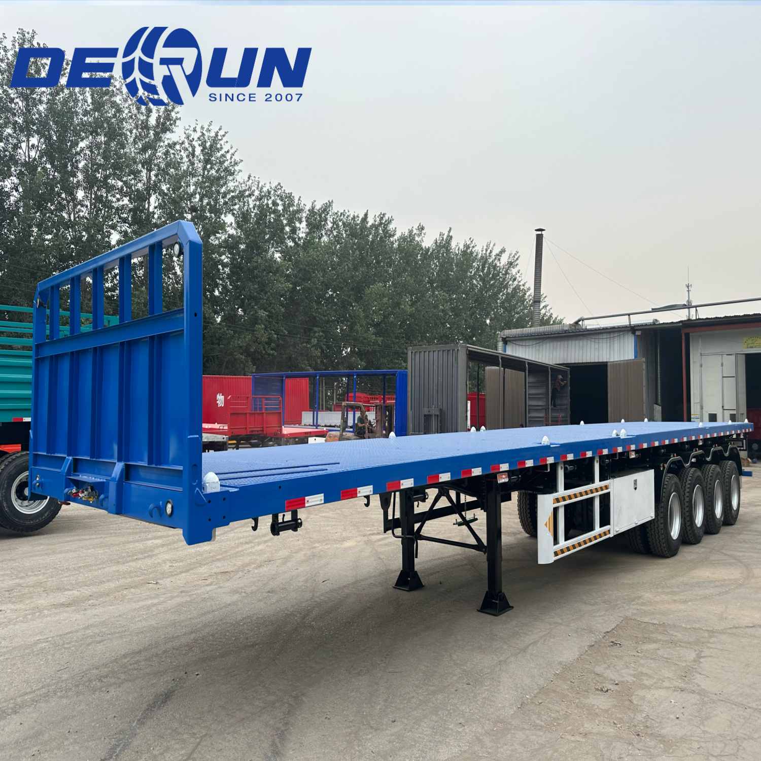 Maidir leis an leath-leantóir leath-acastóra leacaithe, is cineál leantóra ardfheidhmíochta, ardfheidhmíochta é, atá oiriúnach do éagsúlacht iompair lasta trom. Ceithre Acastóir Flatbed Glacann leathshraitheanna cruach ard-neart chun an fráma a mhonarú, agus tá na bíomaí fadaimseartha agus na cros-bíomaí táthaithe le chéile chun struchtúr fráma spáis soladach a chruthú, a chinntíonn go bhfuil cumas ard-ualach ualach. Is é a chóras fionraí ná fionraí earraigh phláta cruach neamhspleách le friotaíocht ard agus friotaíocht tionchair, ar féidir leis cumas luchtaithe na mbonn a laghdú go héifeachtach. Ag an am céanna, tá córas coscáin aeir dé-chiorcaid agus córas coscánaithe frith-ghlais roghnach ABS ann chun sábháilteacht tiomána a chinntiú. Tá an leath-leantóir leath-acastóireach oiriúnach le haghaidh tógála, mianadóireachta, loighistice agus tionscail eile, atá in ann gach cineál trealaimh mhóra a iompar, mar shampla tochaltóirí, ollscartairí, craenacha, etc., chomh maith le lastaí bulc trom, amhail mianta agus gual.