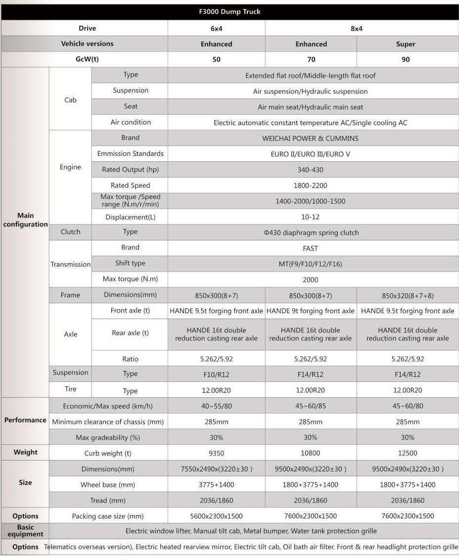 Tá inoiriúnaitheacht ard ag Truck Dumpála Shacman F3000 6x4 8x4: seachadann an t-inneall íseal-chasmhóiminte tús tapaidh agus cumas dreapadóireachta den scoth chun dul in oiriúint do gach cineál coinníollacha bóthair innealtóireachta crua.