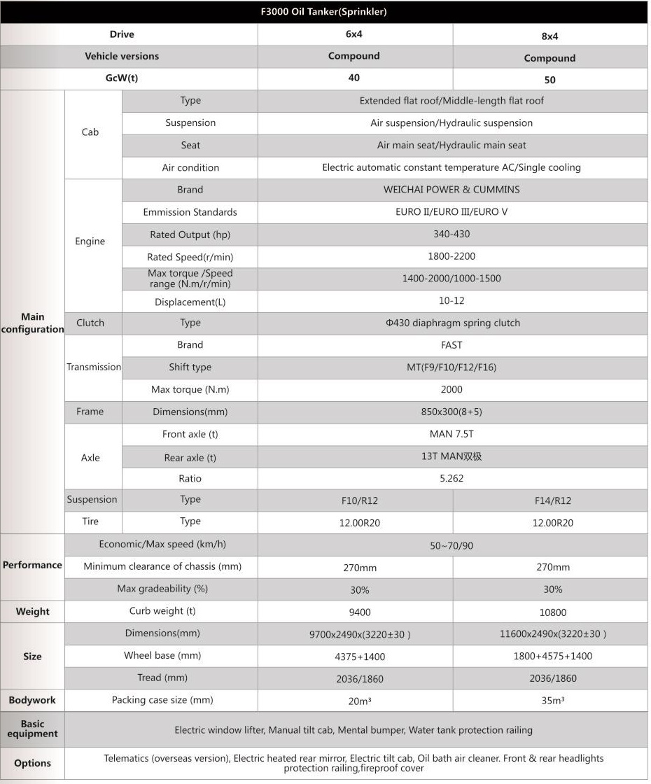 Shacman F3000 6x4 & 8x4 Truck Umar Breosla Ola Is tancaer ola ardfheidhmíochta é a sheol ShaanqiGluaisteán, a úsáidtear go forleathan i go leor réimsí amhail peitriceimiceach, loighistic agus iompar de bhua a fheidhmíochta iontaofa, a chumhacht láidir agus a shábháilteacht den scoth.
