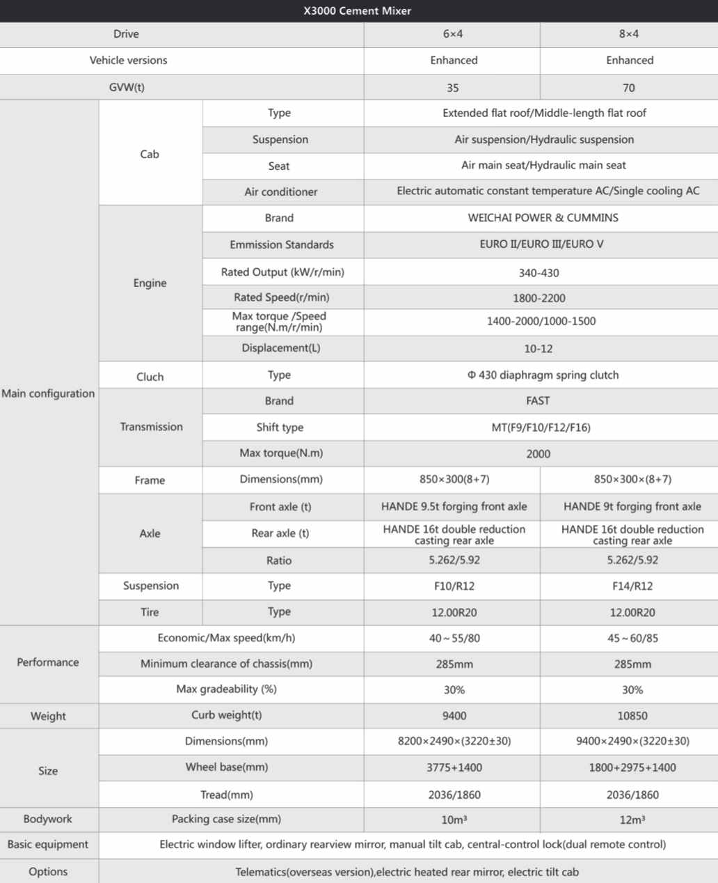 Tá an chassis feistithe le hinnill Wuxi Chaiwei WP10/WP12, agus tá an chumhacht uasta idir 350 agus 460 eachrthóg. Déantar é a mheaitseáil le tarchur 12-luas Fatai agus acastóir teicniúil Hande Man, atá oiriúnach do choinníollacha casta an láithreáin tógála. Glacann an CAB le dearadh fionraí ceithre phointe agus tá suíocháin ionsúite turraing-mhála aeir ann, rud a chuireann go mór le compord an tiománaí. Déantar cóireáil ghainimh frith-chreimthe ar dhromchla an umair, agus is féidir córas spraeála roghnach a shuiteáil chun coincréit a chosc ó chloí. Is féidir leis an bhfánán urscaoilte cúil 270 céim a rothlú, agus eagraítear an luamhán Oibríochta go lárnach ar thaobh na láimhe deise den fheithicil, ag éascú rialú beacht aon duine. Comhlíonann an fheithicil ar fad na caighdeáin náisiúnta astaíochta VI agus is réiteach iompair coincréite éifeachtach agus neamhdhíobhálach don chomhshaol í do thionscadail tógála uirbí.